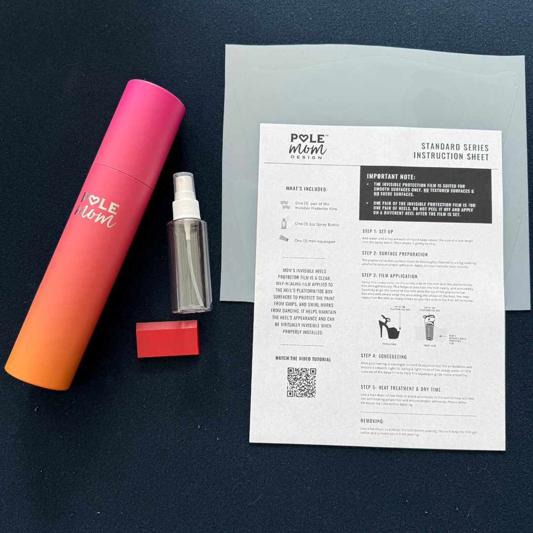 Mom’s Invisible Heels Protector is a clear, self-healing film applied to the platform/toe box to protect against chips, scuffs, and swirl marks from dancing. It preserves your heels’ appearance and is virtually invisible when properly installed.